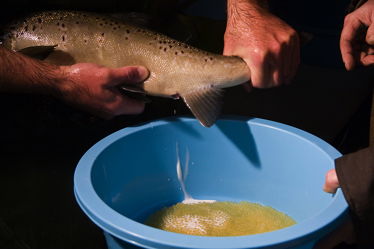 Gemeinsam mit unseren Partnern in Frankreich und der Schweiz fangen wir jährlich einen Teil der nun wieder zurückkehrenden Lachse an den Kontrollstationen der Fischpässe im Rhein, um sie zum Aufbau eines Elterntierstammes zu nutzen. Eier dieser „neuen heimischen“ Rheinlachse bilden nun eine wichtige Grundlage für die weiteren Besatzmaßnahmen.